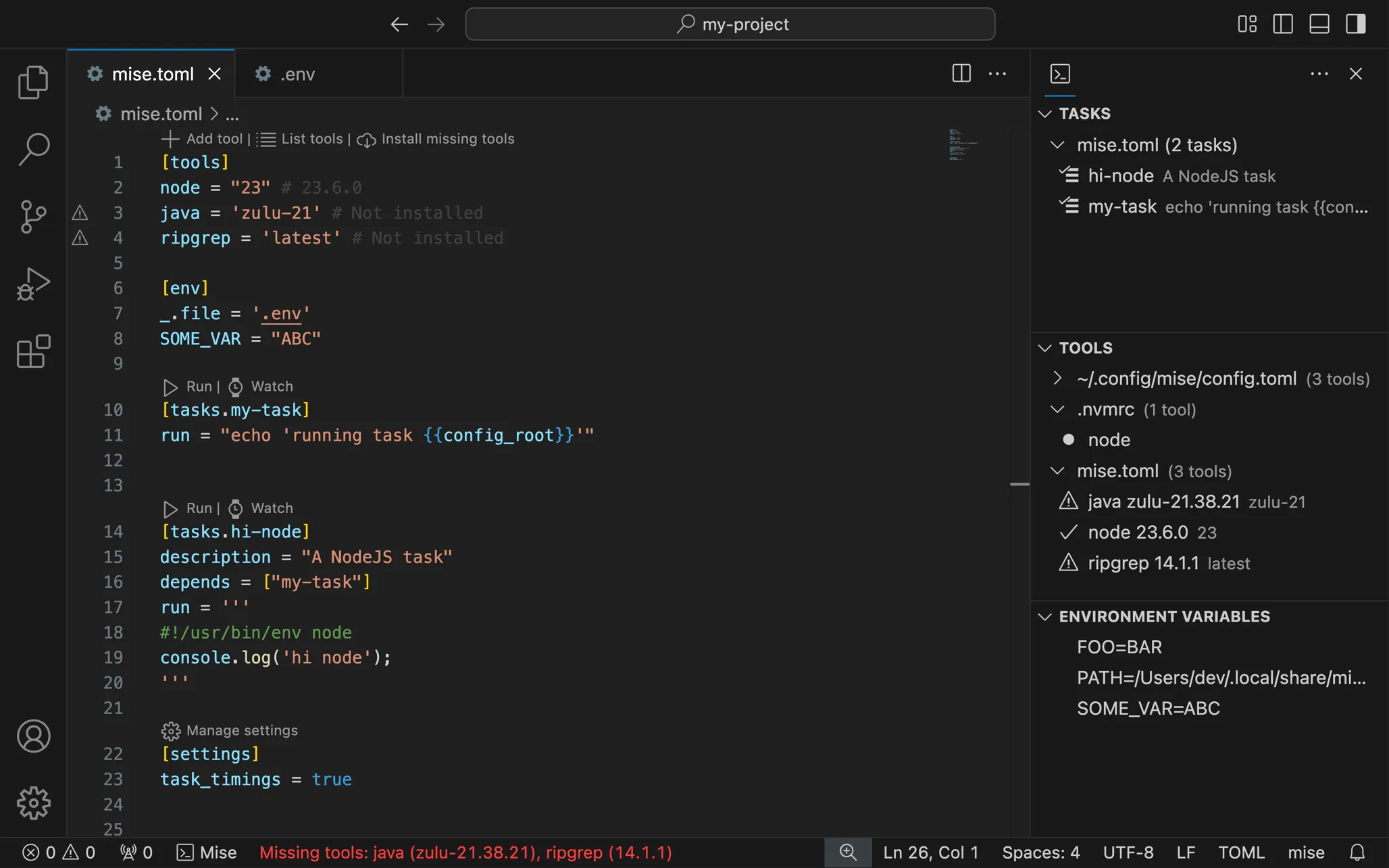 Run mise tasks directly from mise.toml files, the command palette, or activity bar. Create new tasks easily with built-in snippets and view task dependencies in a visual graph. Learn More →